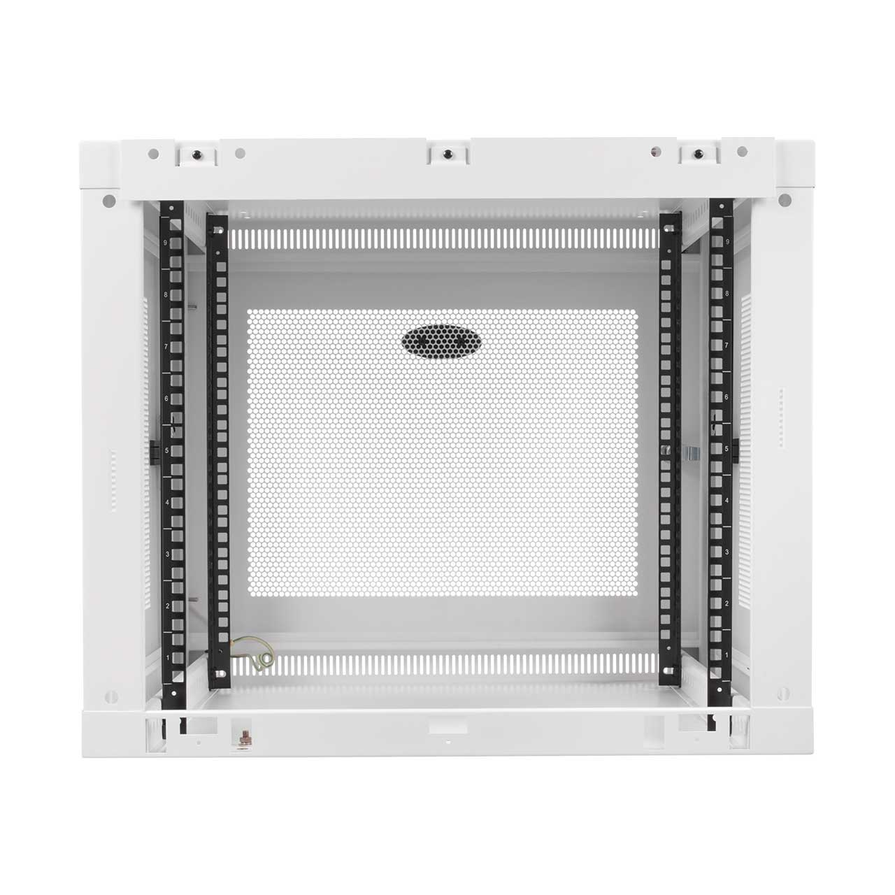 This 9U server rack comes fully assembled and ready to mount to the wall with user-supplied hardware. The side panels can be removed for convenient installation, maintenance and replacement of equipment. Front and rear mounting rails adjust independently to accommodate equipment up to 20.5 inches deep, including network switches and patch panels. Hardware for mounting equipment inside the rack is included.