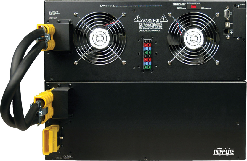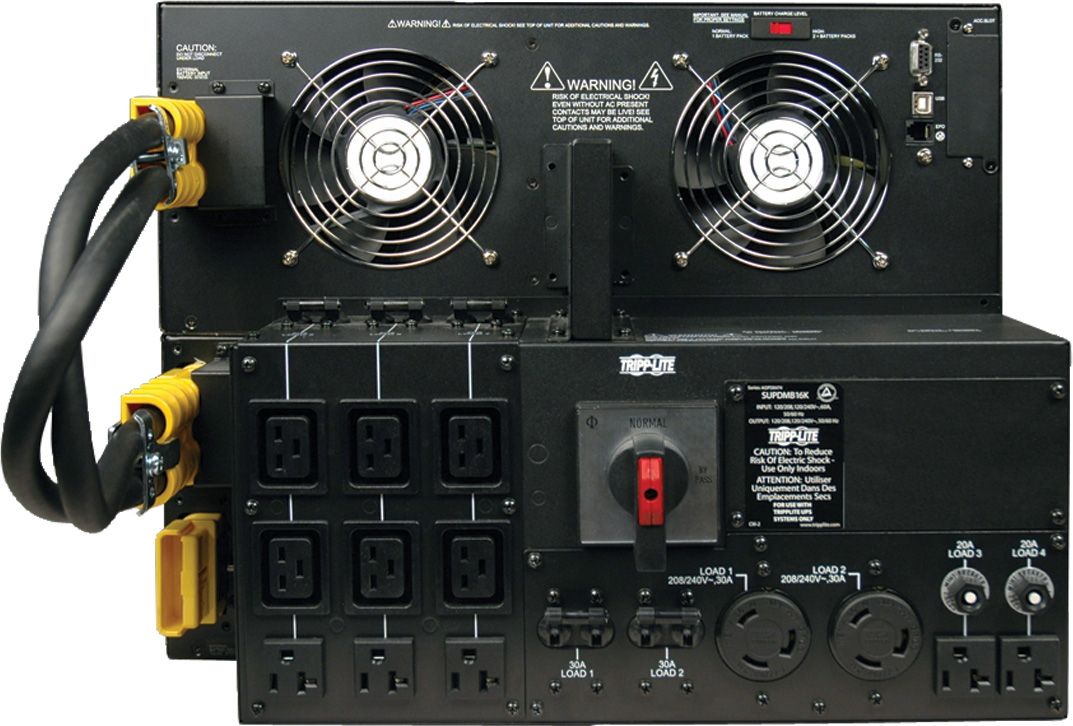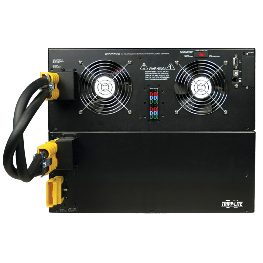 Tripp Lite 16kVA SmartOnline Hot-Swappable Modular Rack/Tower UPS offers 16,000 VA on-line, double-conversion UPS support for server, network and telecommunications equipment. Maintains battery-derived AC output during blackouts with active, full-time power conditioning. Fault-tolerant auto-bypass prevents unexpected service interruptions during overload or internal fault conditions. 4U power module and 4U external battery pack installs in 8 rack spaces (8U). Upright tower installation supported with optional accessories. Maintains full-time sine wave output within 3% of selectable 208/120 or 240/120V AC. Corrects brownouts and overvoltages from 65V to 140V (L-N). Expandable runtime with optional external battery packs. Converts raw input from AC to DC, then resynthesizes output power back to perfect sine wave AC output with enhanced protection from harmonic distortion, fast electrical impulses and other hard-to-solve power problems not addressed by other UPS types. Highly efficient operation in optional economy mode setting, saving BTU heat output and energy costs. Network-grade AC surge and noise suppression. Network management interfaces include combination DB9 RS-232 enabled and dry contact serial port, enhanced USB port and SNMPWEBCARD slot. HID-compliant USB interface enables integration with built-in power management and auto shutdown features of Windows and Mac OS X. Supports simultaneous detailed monitoring of equipment load levels, self-test data and utility power conditions via all 3 network interfaces. Includes PowerAlert monitoring software and complete cabling. Supports Emergency Power Off (EPO) via built-in interface. Front panel LEDs and LCD readout with scroll controls support visual monitoring of all major UPS functions. LED/LCD display panel easily rotates for viewing in rackmount or tower configurations. Split phase 4 conductor hardwire input and output supported. UPS supported outlets include two L6-30R, six C19 and 5 low voltage 5-15/20R. Output connections are mounted on a detachable backplate with manual bypass switch to enable hot-swappable UPS replacement without powering off connected equipment. External battery packs are field replaceable and hot swappable. Attractive all-black color scheme. $250,000 connected equipment insurance.