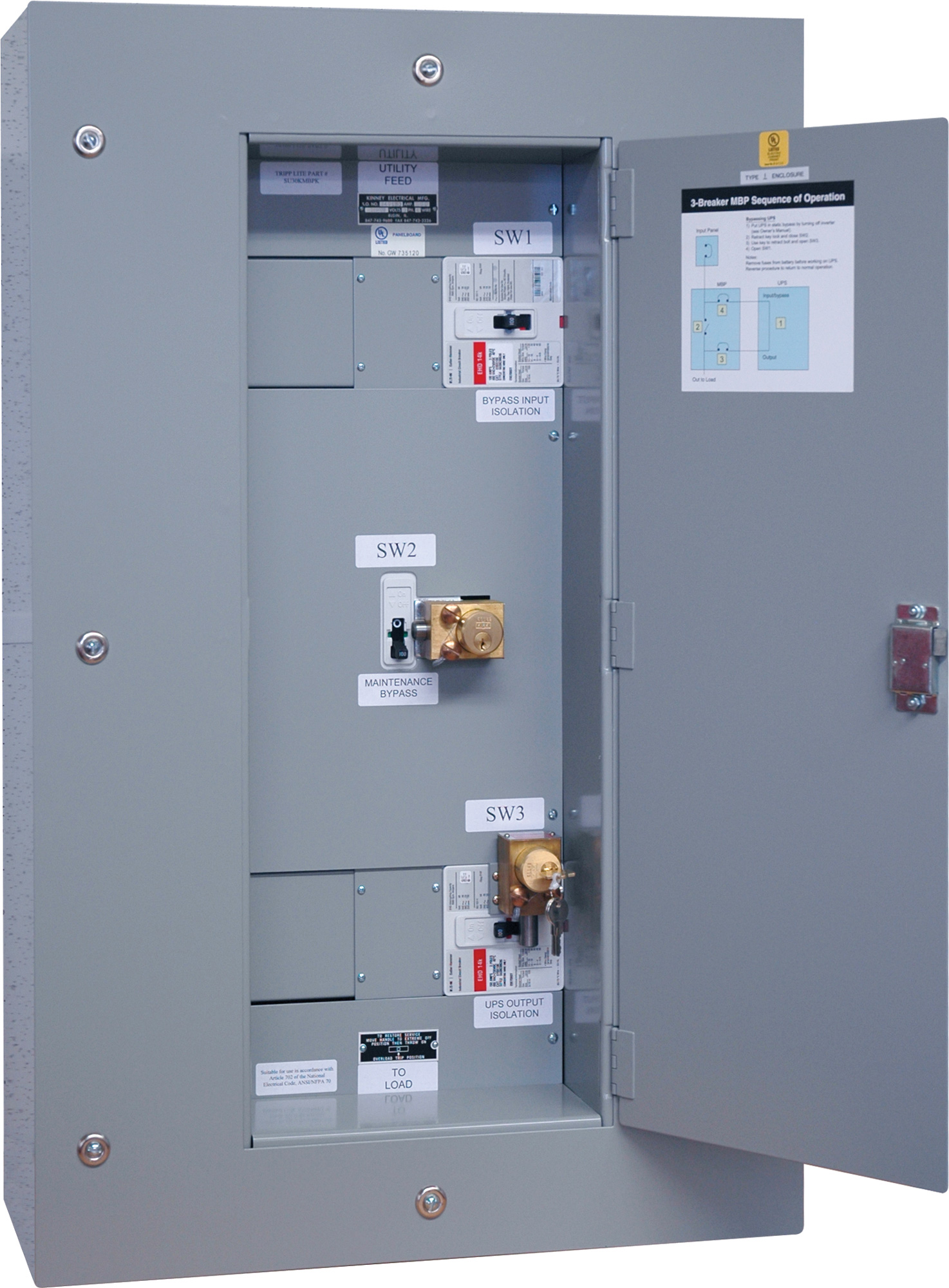 Wallmount 3 breaker manual bypass panel with Kirk Key interlock system isolates the UPS from connected loads for maintenance with no loss of network availability. 80A breaker with KAIC rating of 14. Key included.Compatible with Tripp Lite SVT30KX, SVX20K_, S3M30KX, S3M30KX-NIBandSU40KX