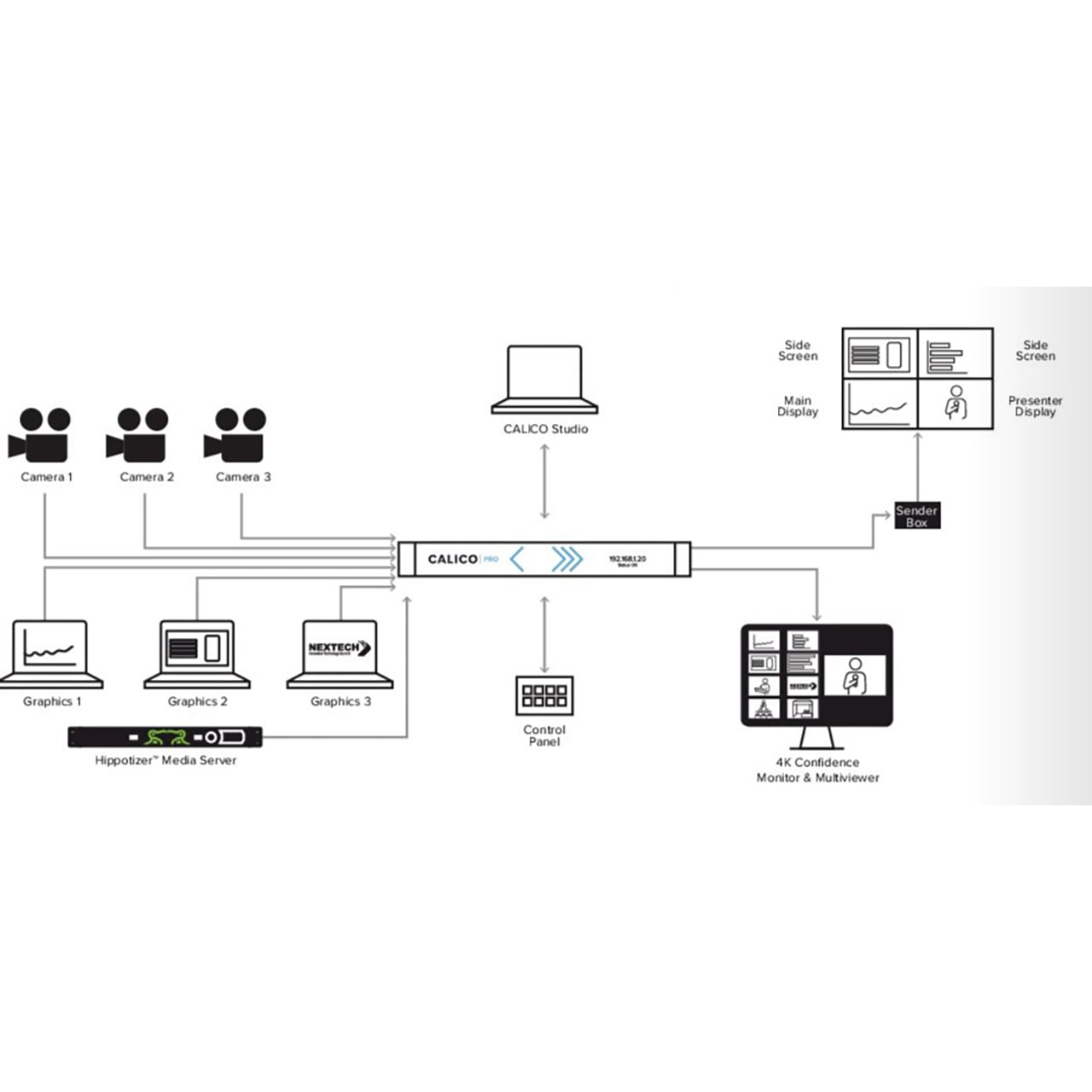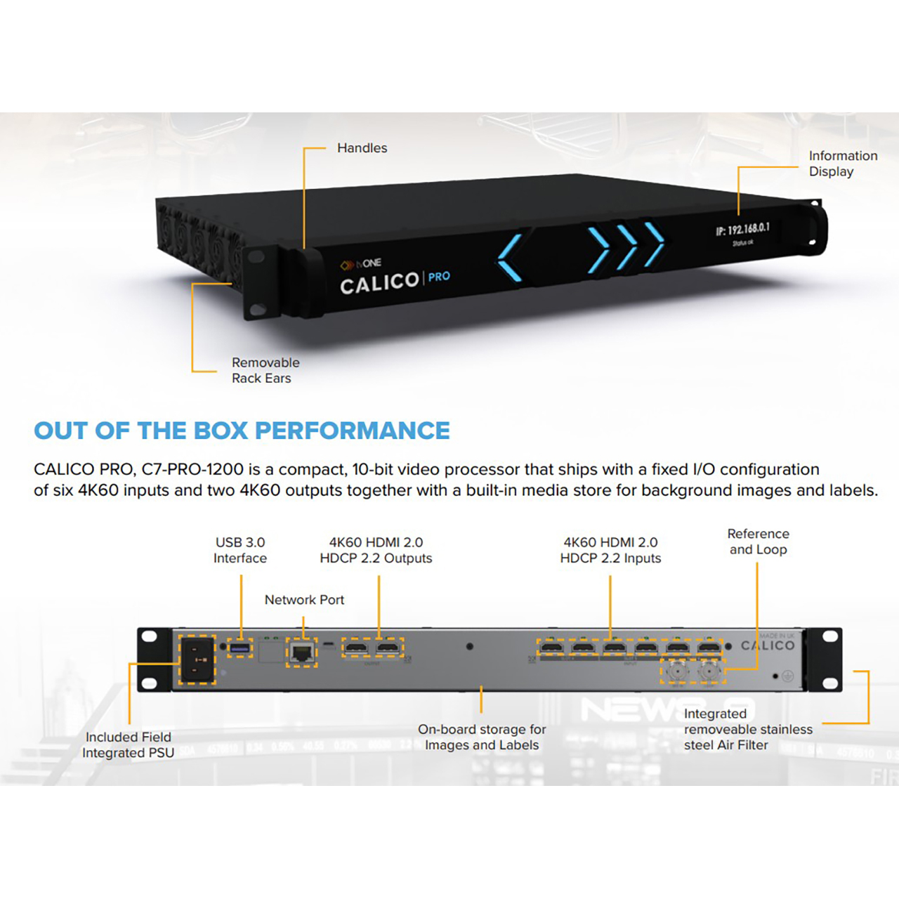 Calico Pro is optimized for unrestricted, uncompressed, end-to-end performance even when working with 4K @ 60Hz video. Using patented tvONE technology, Calico delivers high data rate video processing levels, combined with both physical and IP-friendly workflows.