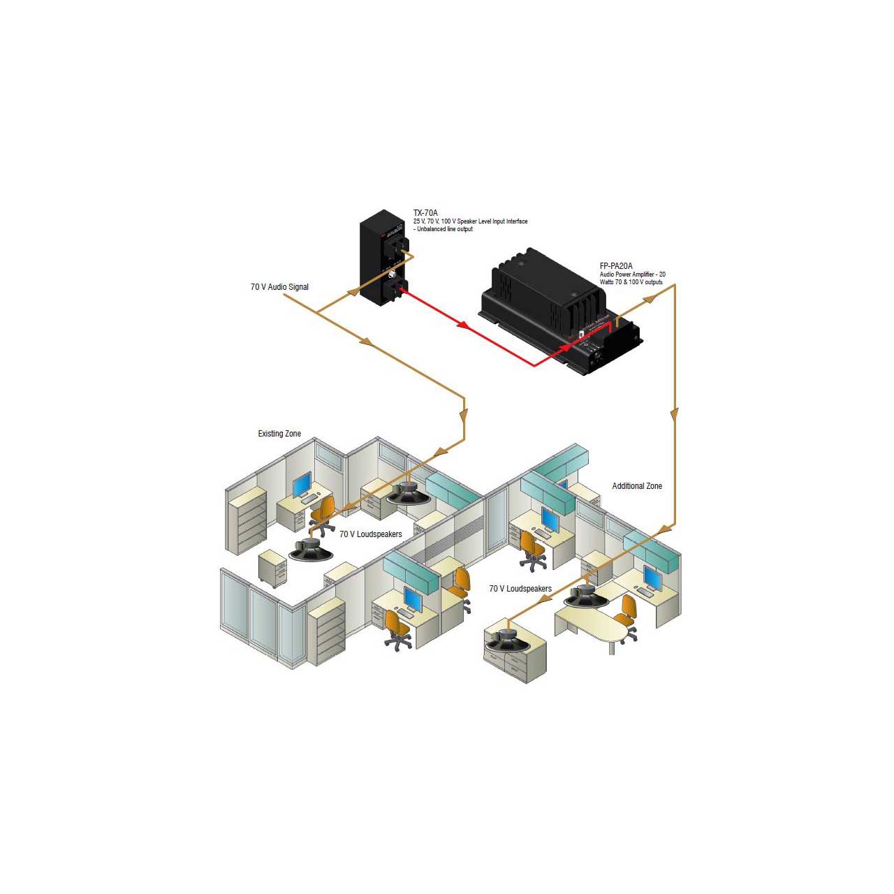 The TX-70A 70/25/100 volt input interface matches a 100, 70 or 25 volt speaker line to any unbalanced line level audio input. Simply install the TX-70A as you would a 70V speaker tap and adjust the trimmer for proper output level.