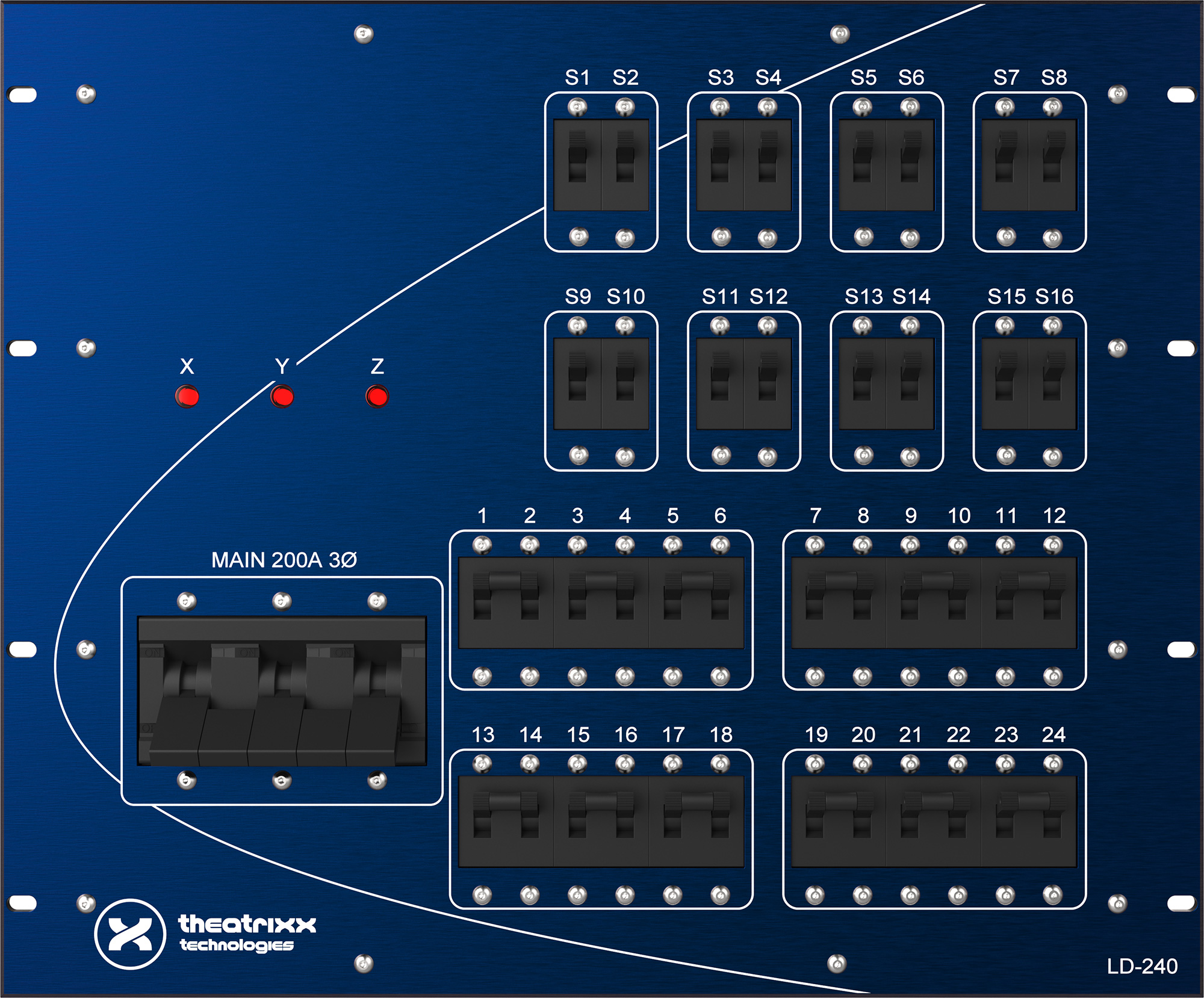 Built to withstand the daily hazards of touring, this LD-240-C Theatrixx electrical distribution features an impressive amount of options for such a compact format (nine rackmount units). The front panel is cut from a thick 3/16" aluminum sheet and is fixed to a robust steel chassis with rear support. All breakers can be installed behind the front plate with a spacer ensuring their protection by being recessed (optional).