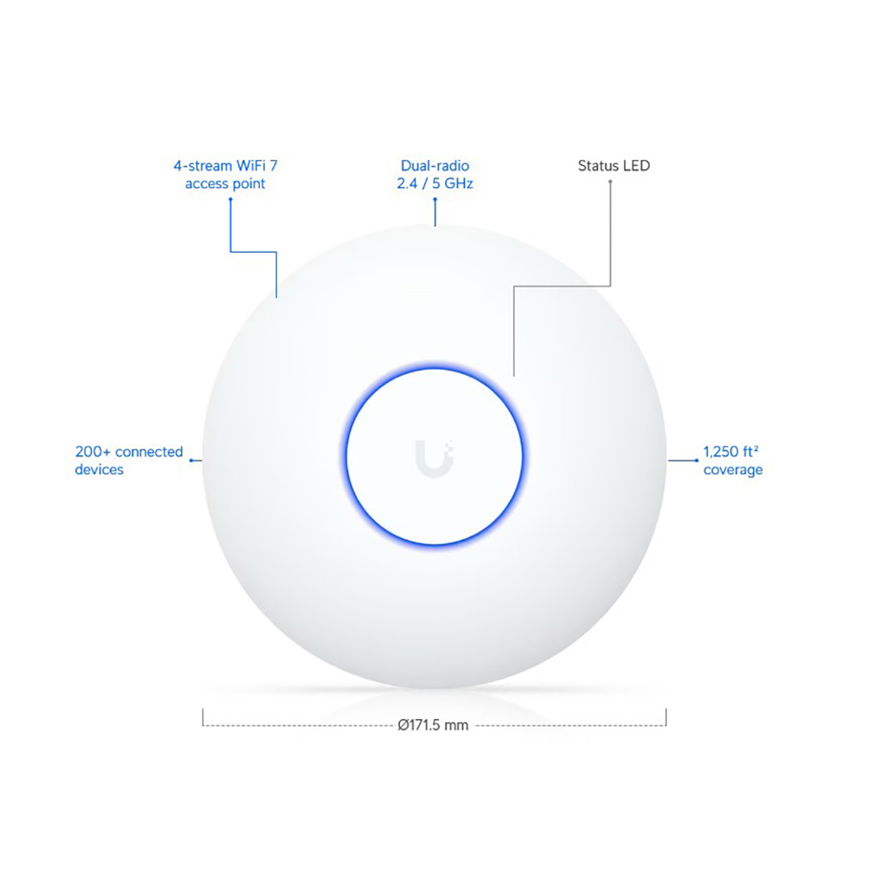 The Ubiquiti U7-LITE compact, ceiling-mounted WiFi 7 Access Point with 4 spatial streams and 2.5 GbE uplink.