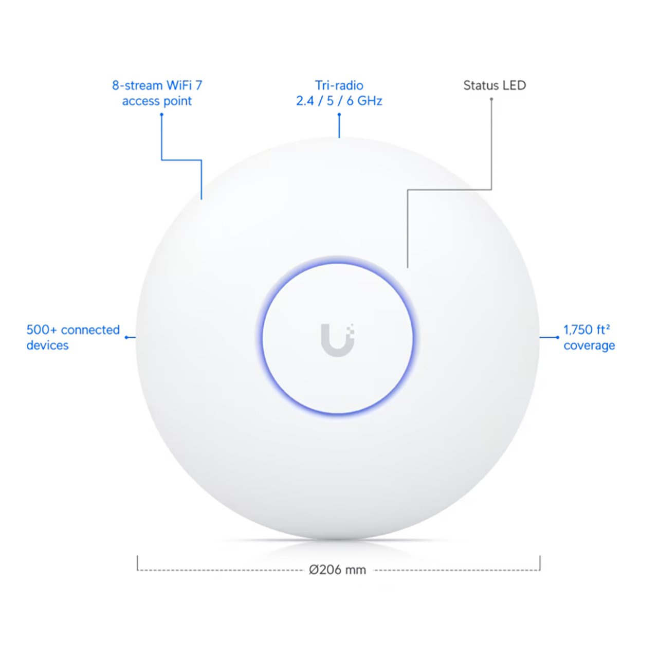 Ubiquiti UBI-U7-PRO-MAX is a ceiling-mounted WiFi 7 AP with 8 spatial streams, 6 GHz support, and a dedicated spectral scanning engine for interference-free WiFi in demanding, large-scale environments.
