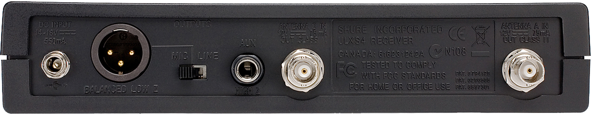 The Shure ULX Standard receiver offers an exceptional value in both performance and price, for both working musicians and sound installers. The feature set of the versatile ULXS4 receiver offers a direct path to full, clear audio signals, unencumbered and unattached. Features Automatic Frequency Selection, Over 1400 selectable frequencies, Predictive Diversity, RF presence LED, 5-segment audio meter, 3-segment transmitter battery fuel guage, Multi-function LCD, 1/2 rack design, Detachable 1/4 wave antennas, Durable plastic chassis, Locking DC connector, XLR and 1/4" outputs, and Mic/line switchable.
