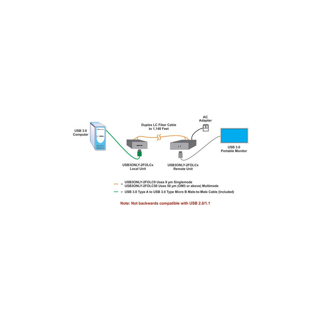 The NTI USB3ONLY-2FOLC9 XTENDEX® 1-Port USB 3.0 extender provides the ability to extend the distance of your USB 3.0 (5 Gbps) device up to 350 meters (1148 feet) over LC Duplex OM3 (or above) Multimode fiber optic cables. The Receiver unit also supports USB Type-C devices using a conversion cable. It overcomes the copper USB cable length limitation without EMI concerns, making it ideal for sensitive environments. This system is Plug-and-Play without having to install software or drivers offering a fast and easy solution for home, campus or business applications.