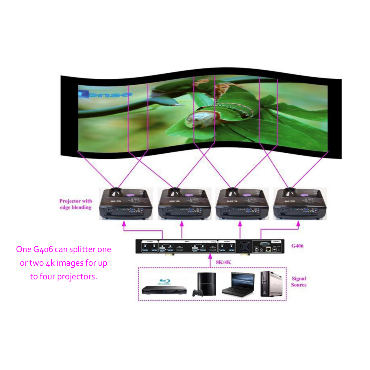 - Split a signal source into 4x WUXGA resolution for projector edge blending
