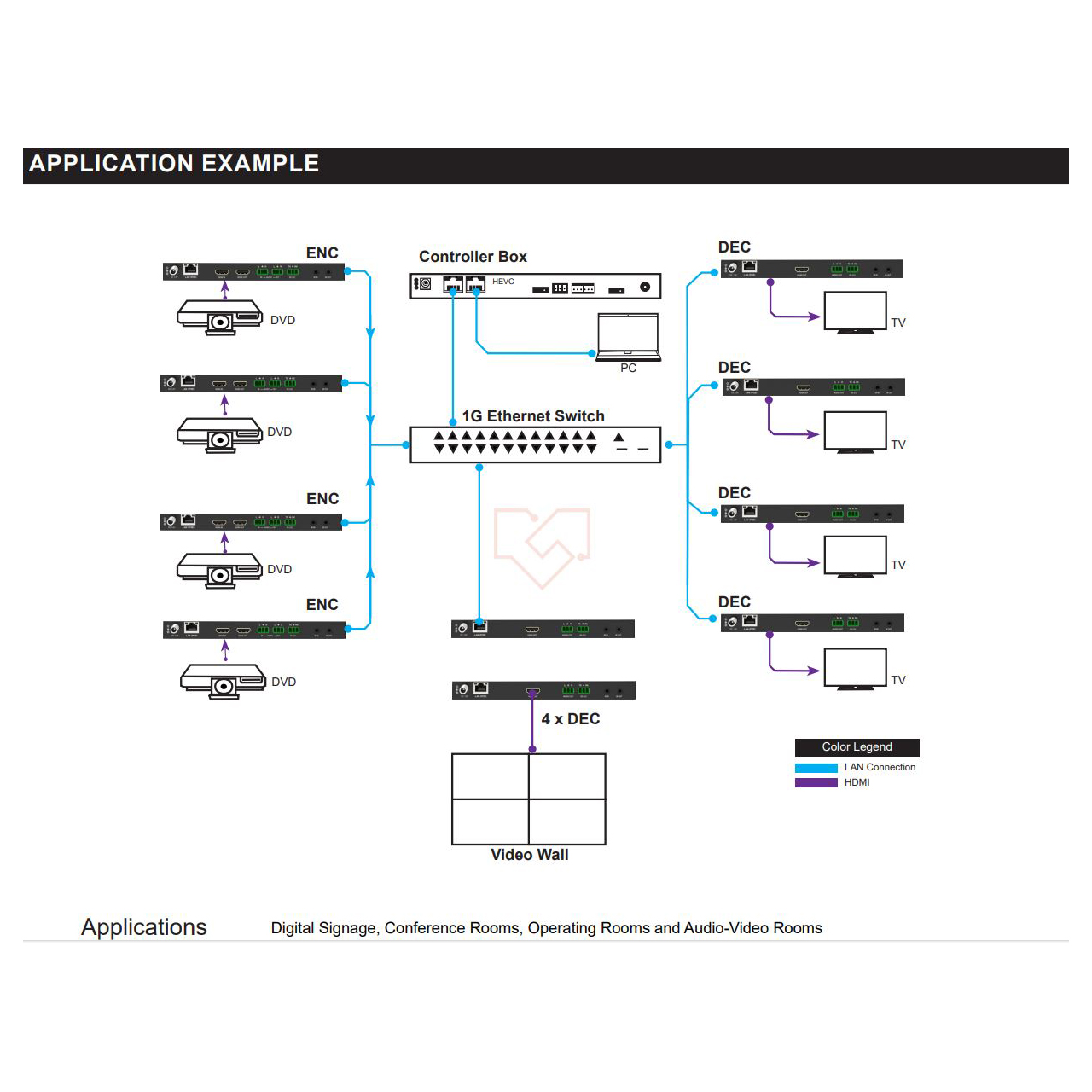 The VigilLink VLIP-H5HD-EC AV over IP product distributes multiple HD contents to multiple HD display devices over a 100M/1G Network Switch. It offers configurable high-quality, low-bandwidth H.265/H.264 configurable compression video and supports resolution up to 1920x1200@60Hz 4:4:4. Signal transmission distance can be extended up to 328ft / 100m via CATE5E/6/6A/7 cable. The product supports analog audio embedding and extracting. It also supports RS-232 control (pass-through & Guest mode) and single-machine control (without a Controller Box, matrix switching can be realized with panel buttons or RS-232 control).