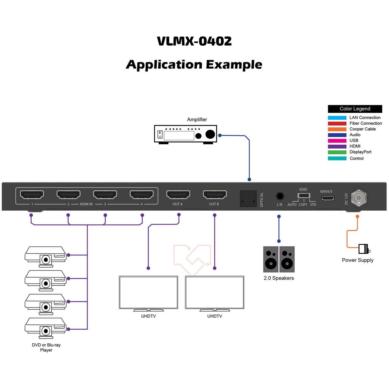 This VigilLink VLMX-0402 high-performance HDMI Matrix Switcher can switch any of these four HDMI sources to two HDMI displays. It supports resolution up to 4K2K@60Hz YCbCr 4:4:4 and HDCP 2.2. It can extract HDMI source device audio to optical and analog L/R output. It supports 4K→1080P downscale function if the source is 4K, but the TV only supports up to 1080P. It also supports ARC and EDID (AUTO/COPY/STD) functions, with its 18Gbps bandwidth and the additional features with the latest HDMI standards, and flexible control via front panel buttons and IR remote.