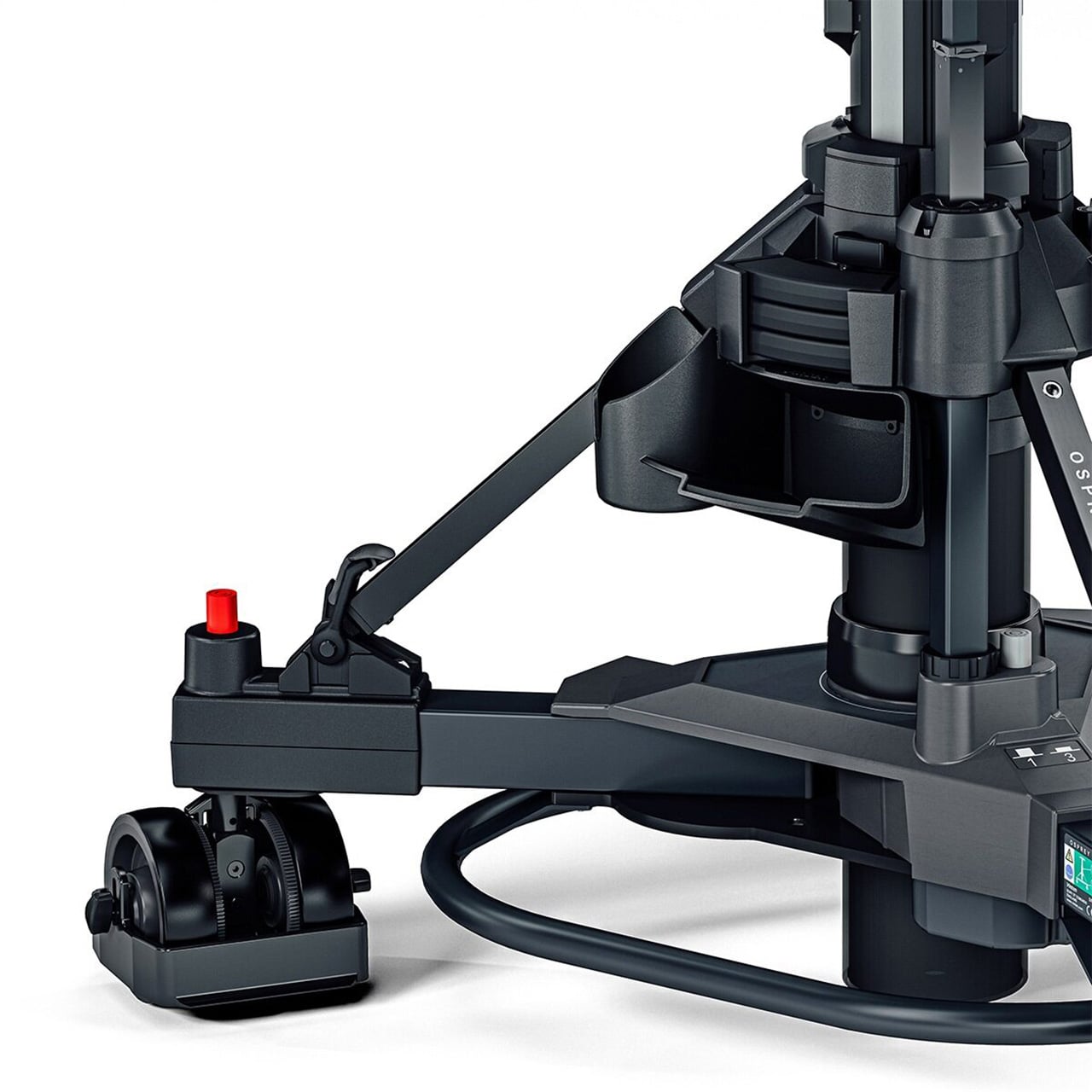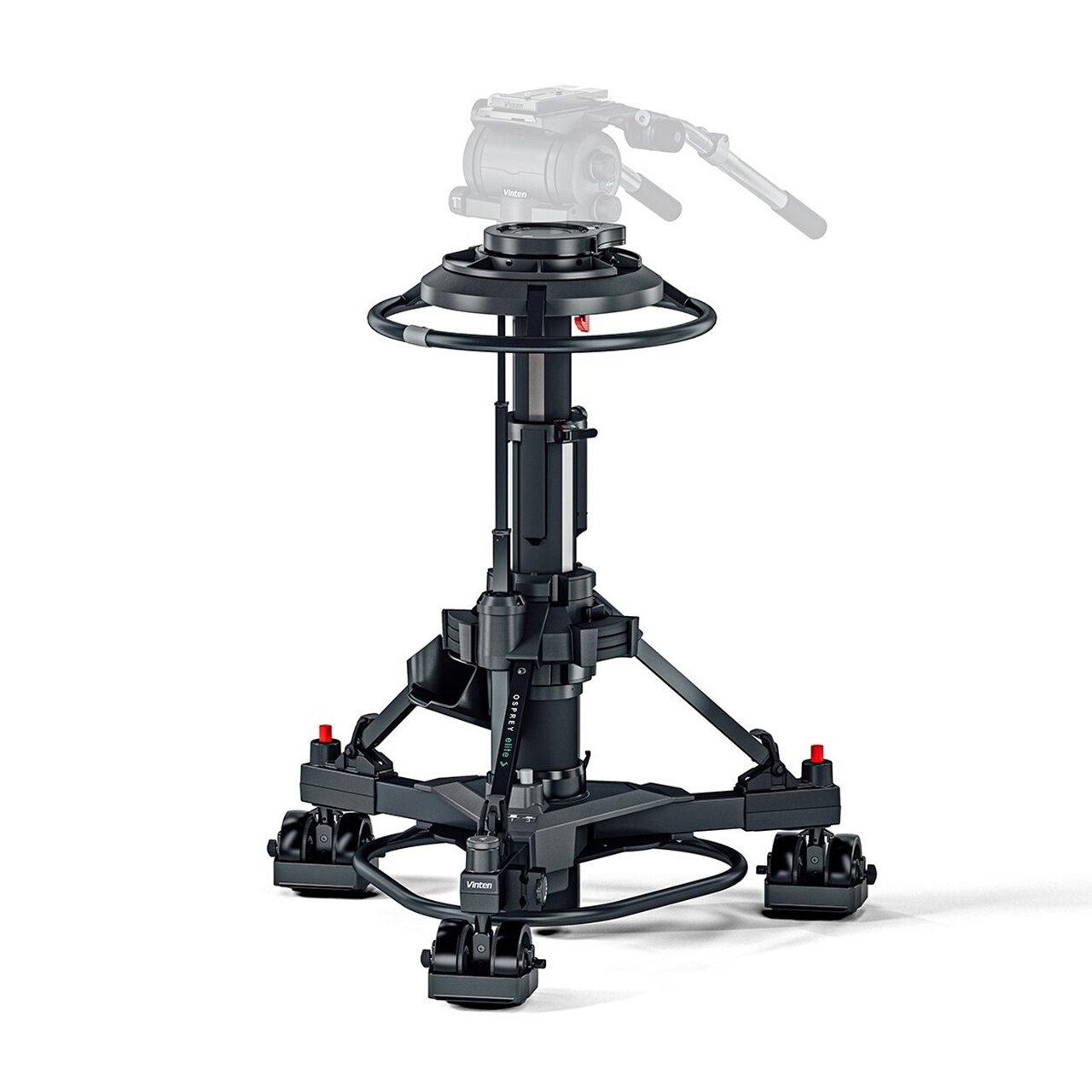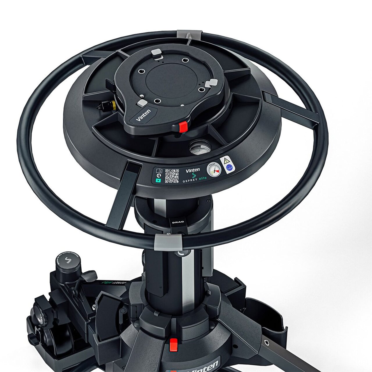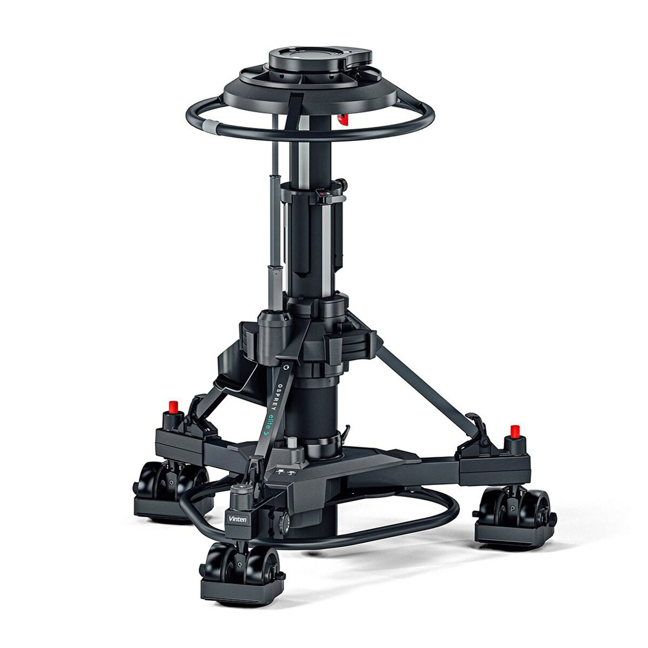 The Vinten Osprey Elite S is a portable, fully functioning studio pedestal for large payloads of up to 177lbs (80kg). A versatile pedestal, capable of supporting large Vinten Vector Heads or full facility digital cameras and teleprompters. It can track talent eyelines from a seated to standing position `on shot' with its extended fully balanced range. It has an inlet valve for any air source, making Perfect Balance easy to achieve. There is a storage area for the camera operator. In addition, the Osprey Elite S pedestal includes a pressure gauge for clear and reliable set-up and the detachable skid allows the pedestal to be simply broken down into two sections for easy storage and transportation. It has a selector for both single wheel and all wheel crab steering for working in tight spaces and on shot direction changes. It comes with 5" (12.5cm) wheels and adjustable cable guards for studio use.