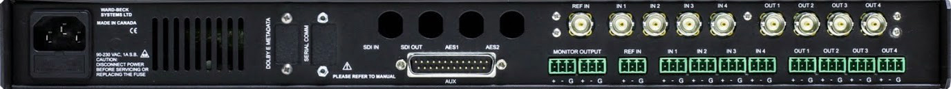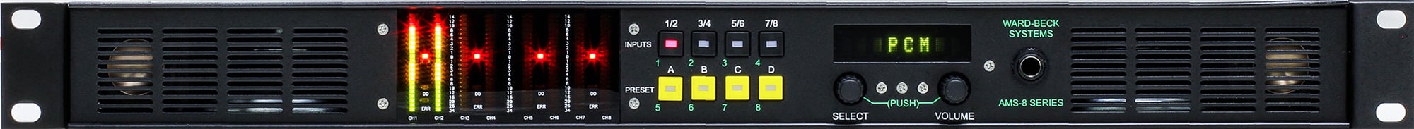 The AMS8-1A is a compact one rack-unit aural and visual monitor designed to handle multi-channel format audio signals. Eight PPM/VU LED bargraphs display signal activity, while a sophisticated multi-speaker system allows operators to listen, with great clarity, to the signal being monitored. The AMS8-1A has four digital audio inputs. 110 Ohm balanced inputs are on 3-pin pluggable screw terminal connectors and 75 Ohm unbalanced inputs are on BNC connectors. An internal switcher allows the operator to toggle between the two banks of four balanced and unbalanced inputs. A reference input for DARS is provided. This may be 110 Ohms, balanced, via a 3-pin pluggable screw terminal connector or 75 Ohms, unbalanced, via a BNC connector. The SERIAL COMM DB9 connector includes GPI and GPO inputs that may be used for tally and external control functions. AES re-clocked copies of the four input signals are provided on the rear panel. The signals are provided as both balanced, on pluggable 3-pin terminals, or unbalanced signals on BNC connectors. The unit provides an analog stereo output that is a copy of the signal being fed to the integral speaker system. This stereo output may be configured to follow the front panel speaker level control or to be a fixed line level output. The AMS8-1A may be field configured to suit the monitoring needs of a particular operation or location, using a combination of the eight segment LED dot-matrix readout, the eight lighted pushbuttons and the two rotary shaft encoders with integral pushbutton switches. Ward-Beck has developed an intuitive scheme to ease programming of the AMS8-1A. Features that can be readily programmed to assist in monitoring include: Creating preset monitoring configuration, creating an infinitely variable proportional stereo mix-down of multiple audio channels, providing global control for monitoring.