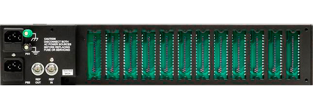 The MF-82/12 can house up to twelve cards and two power supplies and occupies two vertical units of rack space. Headers for each amplifier slot are accessible from the rear of the frame. Terminal interface assemblies for the appropriate amplifier card plug into these headers to allow for input and output connections. When distributing signals on BNC terminations, the MF-82/12 frame provides space for a terminating input and six outputs per card. As an option, MF82 frames can of accept an AES and a video reference input. These two inputs are on 75 Ohm BNC connectors, located on the optional M82REF rear assembly. The hinged, quick release front panel facilitates rapid access to controls and tallies located on the front edge of the amplifier cards. During installation and system setup, the panels may be easily removed to afford unobstructed access to all cards and their controls and tallies. Power supply redundancy in the MF82 frame is carried through the primary mains to the separate switchmode supplies. Two separately fused AC power cords are provided. The switchmode supplies operation on 115V to 230V 50 or 60Hz without any special setup and require 130 VA maximum.