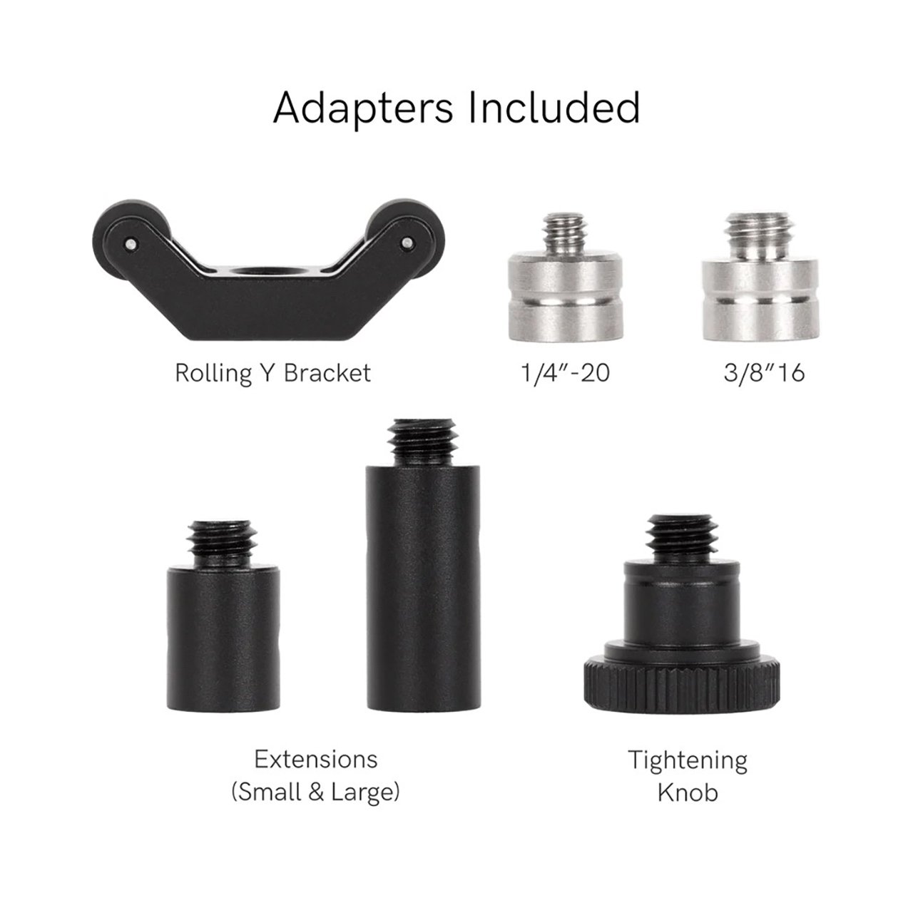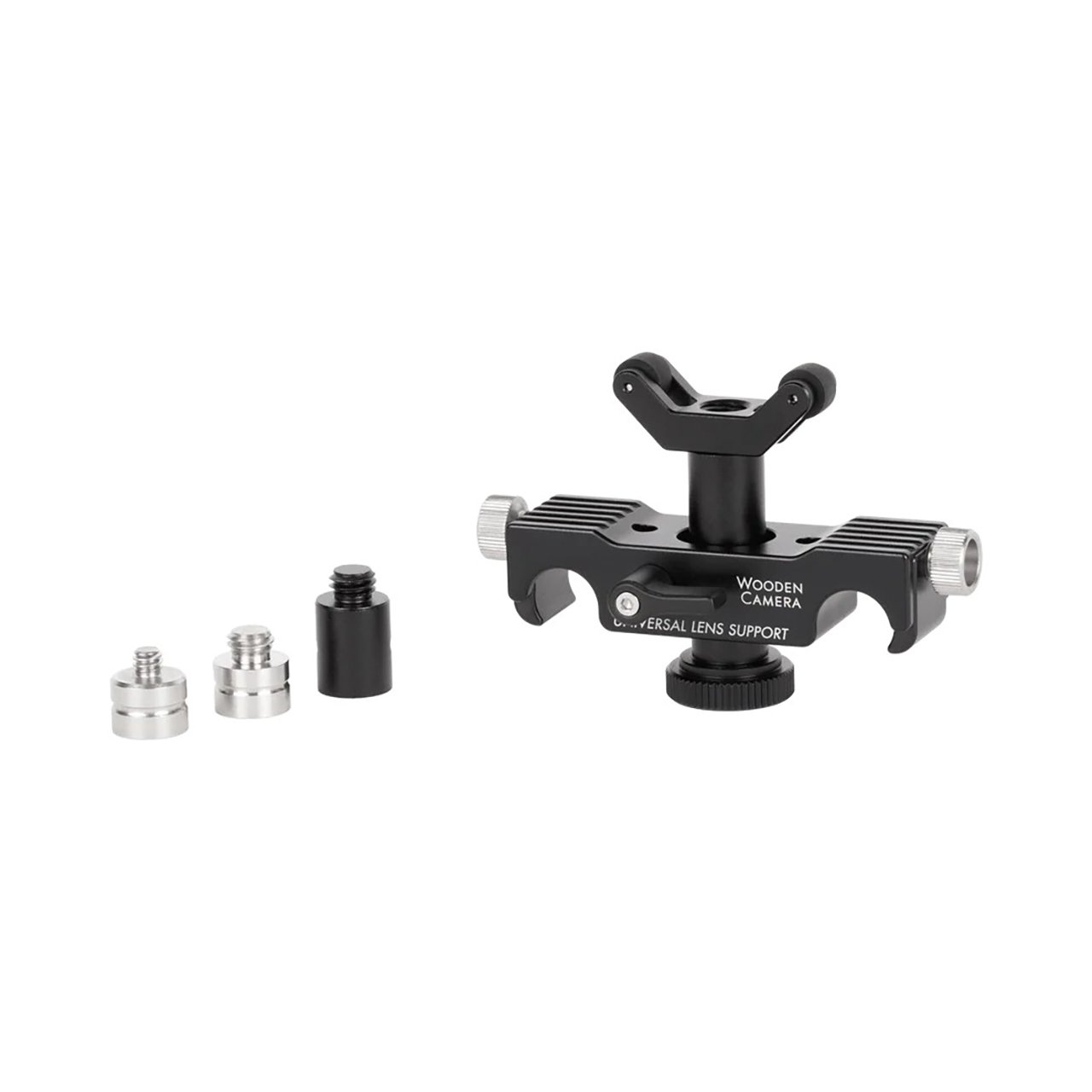 The Wooden Camera 175400 Universal Lens Support (15mm LW) supports heavy lenses when using 15mm lightweight rods.Includes 1/4"-20 cap for attaching to tripod collars and some cinema lenses, 3/8"-16 for attaching to most cinema lenses with standard support foot, and rolling Y bracket for attaching to DSLR type lenses where no support foot is available. Rubber wheels also allow for positioning under rotating focus barrels when necessary. Quick, snap-on installation is possible by loosening thumbscrews. Vertical post can move laterally to accommodate skewed baseplates. Height adjustment meets any diameter lens barrel.