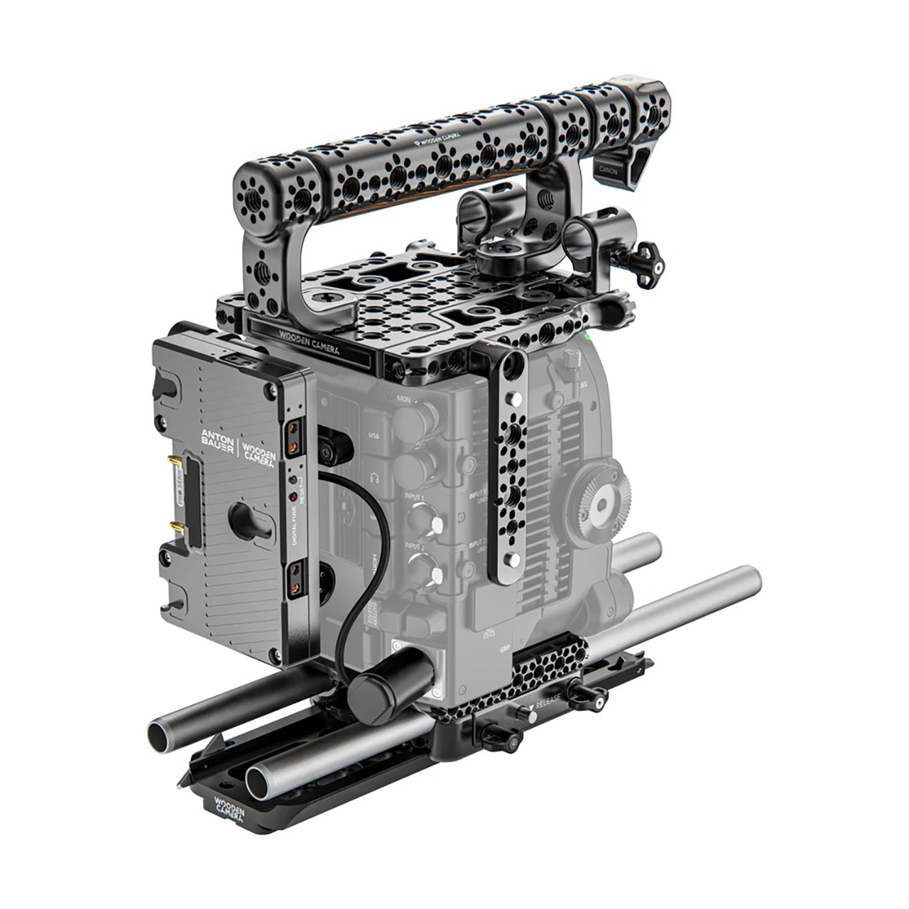 The Wooden Camera K10031 Elite Accessory System for Canon EOS C400 maximizes the camera's on-set capabilities with abundant mounting points for endless accessory configurations. This cage system contains an ARCA Base Plate and Riser System that positions the camera at the appropriate optical height for mounting accessories and allows for quick setup transitions. The Riser Plate can be used alone with the ARCA Shoulder Pad or ARCA Steadicam Plate; the Base Plate is required for tripod or dovetail systems.