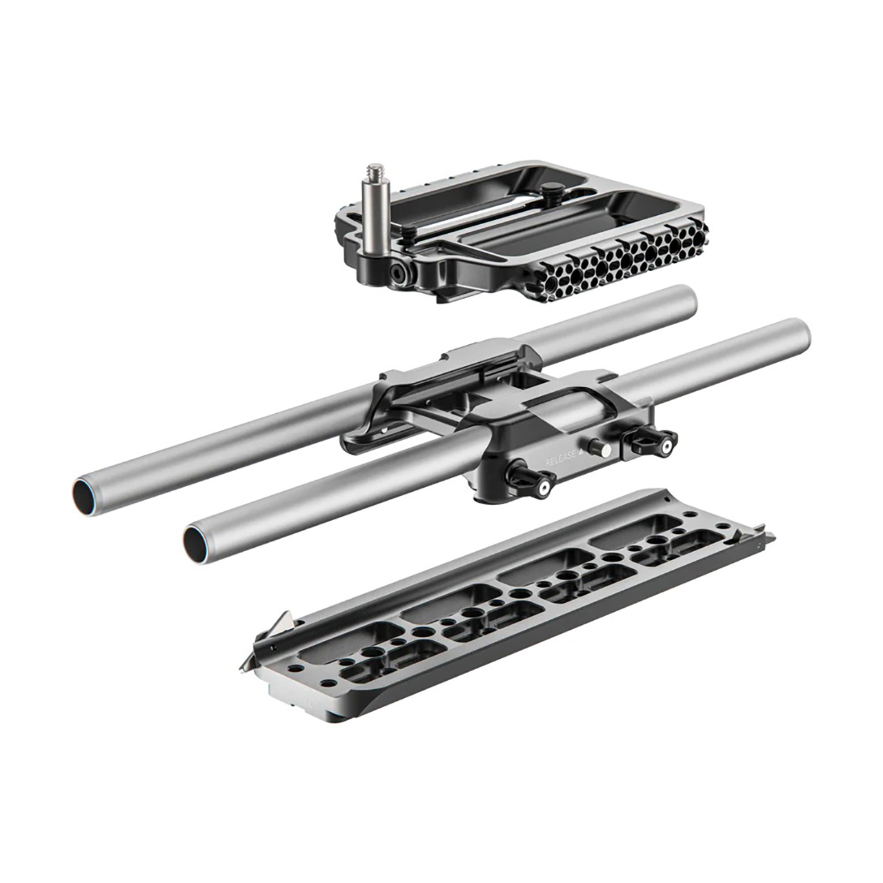 The three-piece Top Plate System lets you replace the native EOS C400 handle with the removable Center Top Plate and Ultra Handle Kit to maximize accessory mounting points. The Dual Rod Bracket can be mounted on the full Top Plate System enabling rod-based mounting. The NATO Side Rail mounts to the Top Plate near the rear of the camera without touching the EOS C400’s handle, providing additional mounting points and the ability to use NATO clamp accessories. Patented anti-twist safety pins ensure secure mounting.