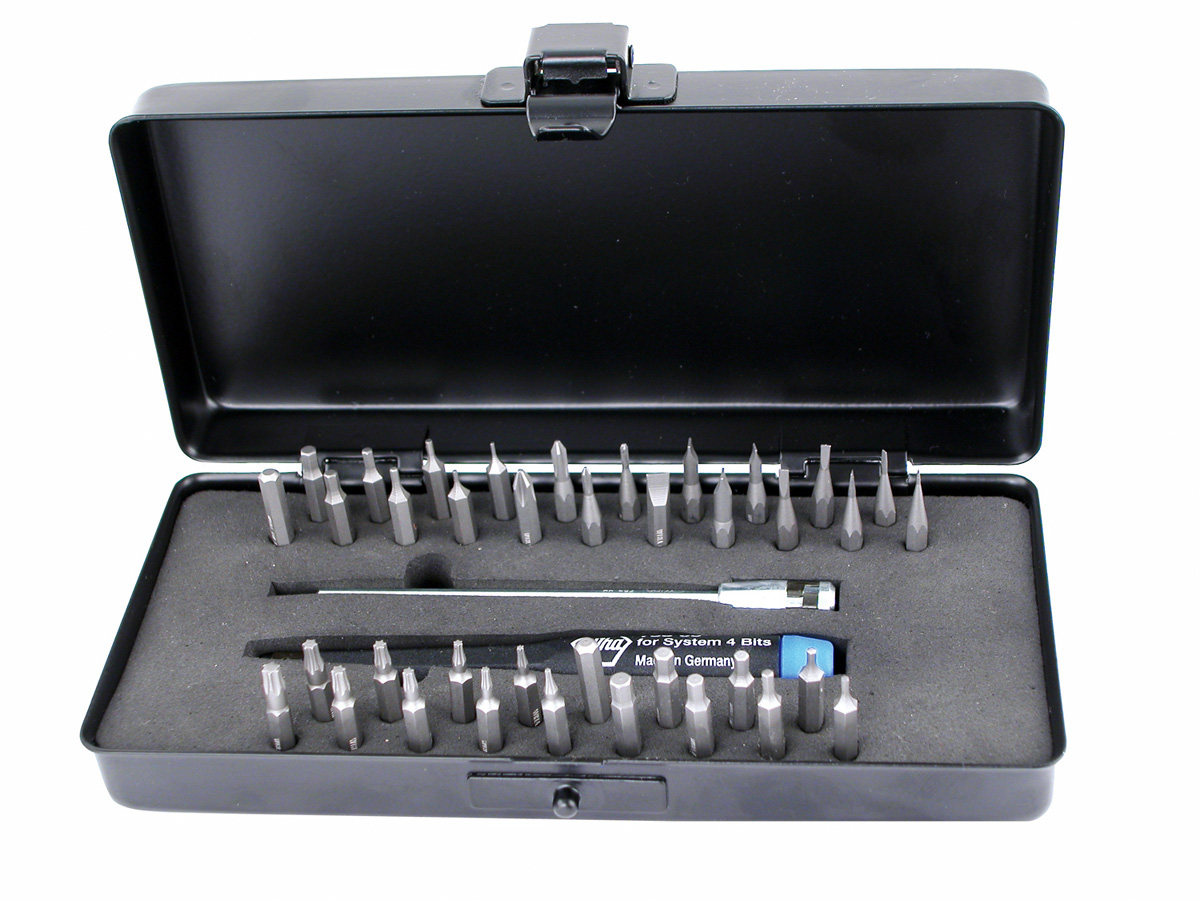 40 Piece set includes: Technicians Precision Handle, 4" Bit Extension, 38 Micro Precision Bits Slotted: .8, 1.2,1.5, 2.0, 2.5, 3.0, 3.5, 4.0 Phillips: #000, #00, #0, #1 Torx: T3, T4, T5, T6, T7, T8, T9, T10, T15, T20 Hex MM: .7, .9, 1.3, 1.5, 2.0, 2.5, 3.0, 4.0 Hex IN: .050,1/16, 5/64, 3/32, 7/64, 1/8, 9/64, 5/3