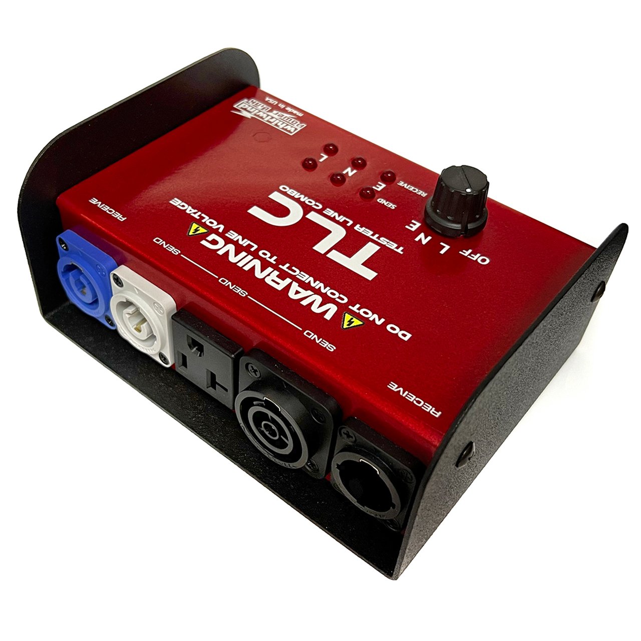 The Whirlwind TLC (Tester-Line Cord) is a dedicated test device for Neutrik Powercon and True Oner three wire power cords. The TLC is a battery powered continuity tester that conveniently verifies the condition of power cables that are difficult to test without applying dangerous line voltage. Each of the three conductors is tested for continuity, shorts and incorrect connections. Six red LEDs indicate correct wiring or any fault conditions. A rotary switch applies test signal to each wire individually to easily determine if it is properly connected at both ends.
