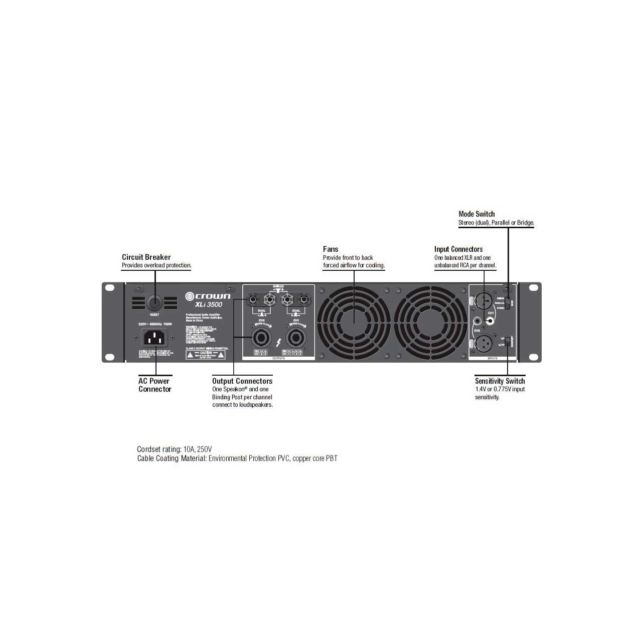 Features include RCA and XLR inputs, user selectable input sensitivity of 0.755V or 1.4V, Speakon and binding post outputs, stereo/parallel/bridge-mono mode, power/fault/signal presence/clip indicators, forced-air cooling; and protection against shorts, no-load, on/off thumps and radio-frequency interference.