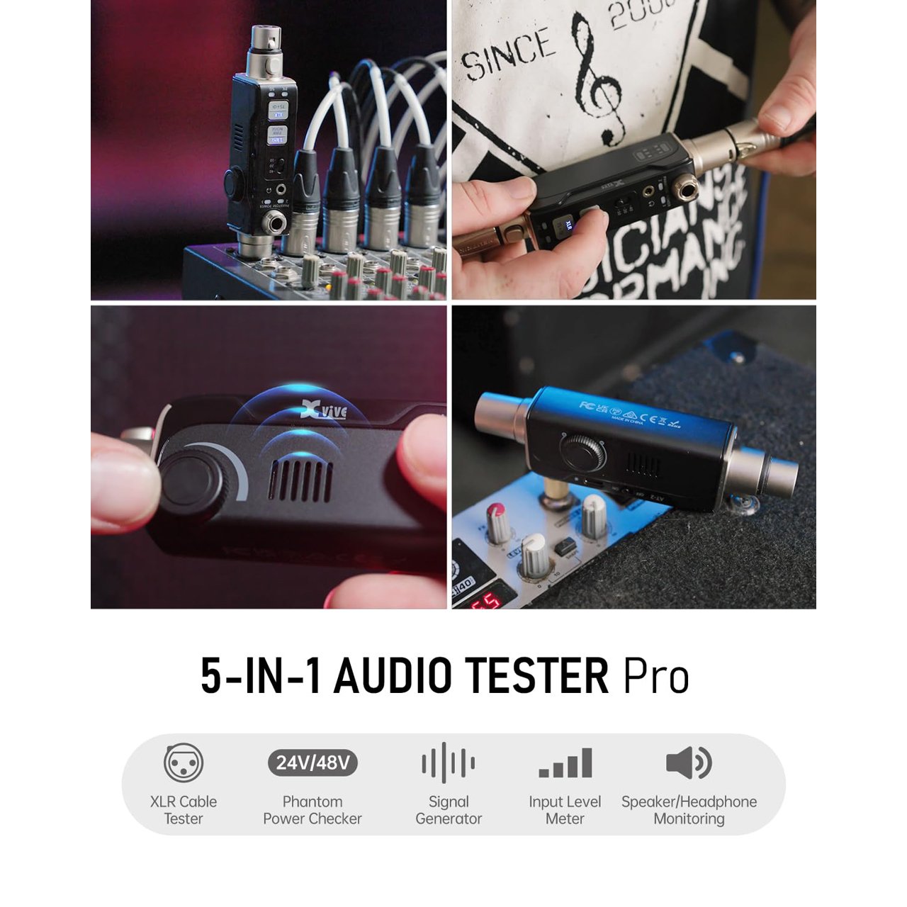 The Xvive AT-2 audio tester integrates a signal generator, XLR cable tester, phantom power checker, input level meter, and headphone/speaker monitoring into a single compact unit. Designed for live sound engineers and audio professionals, it's perfect for testing and troubleshooting PA systems, mixers, DI boxes, and effects units.