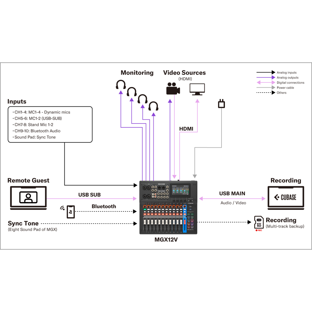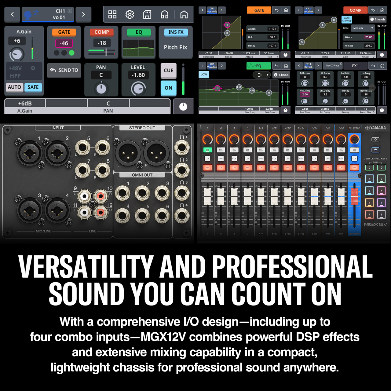 The MGX12V builds on Yamaha's MG legacy with a compact digital mixing console that seamlessly integrates audio and video. In addition to superb sound quality, versatile I/O, and intuitive touch-panel operation, it features a USB-HDMI interface with capture and pass-through, enabling simultaneous high-definition video and audio streaming or recording. With four microphone inputs and four headphone outputs, it is especially well-suited for podcast production with multiple participants, as well as live sound, installed systems, and content creation. Designed for creators, engineers, and performers, the MGX12V elevates production quality and expands creative possibilities across diverse applications.