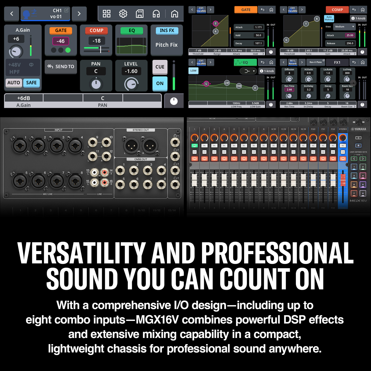 The MGX16V continues Yamaha's tradition of excellence in mixing, offering a professional digital console that delivers premium sound quality, versatile routing, and intuitive operation. Building on the proven MG series, it adds modern functionality with a USB-HDMI audio/video interface for capture and pass-through, enabling seamless integration of high-definition video alongside your audio mix. This unique capability makes it perfect for live sound, installed systems, podcasting, streaming, music production, and recording. Designed for engineers, producers, creators, and performers, the MGX16V combines portability, flexibility, and power-elevating your production quality and engaging audiences across a wide variety of applications.