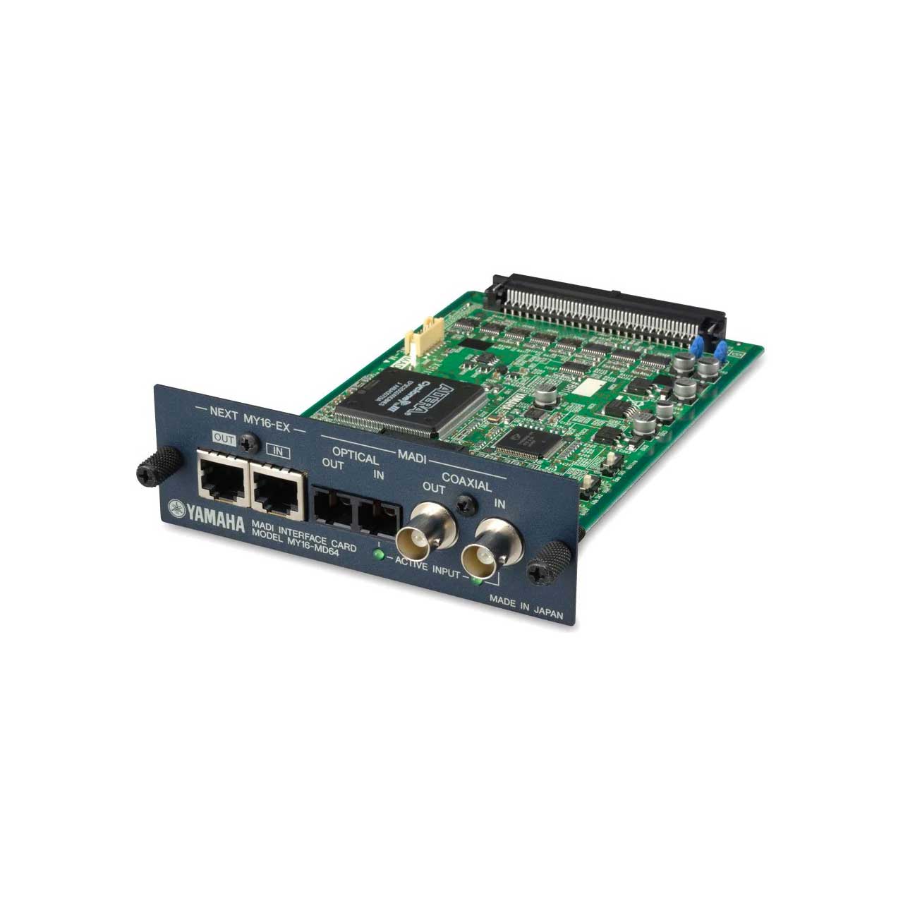 The Yamaha MY16-MD64 is an optional MADI interface card for compatible Yamaha digital mixing consoles and signal processors. It supports 16 input channels and 16 output channels of uncompressed MADI format digital audio.