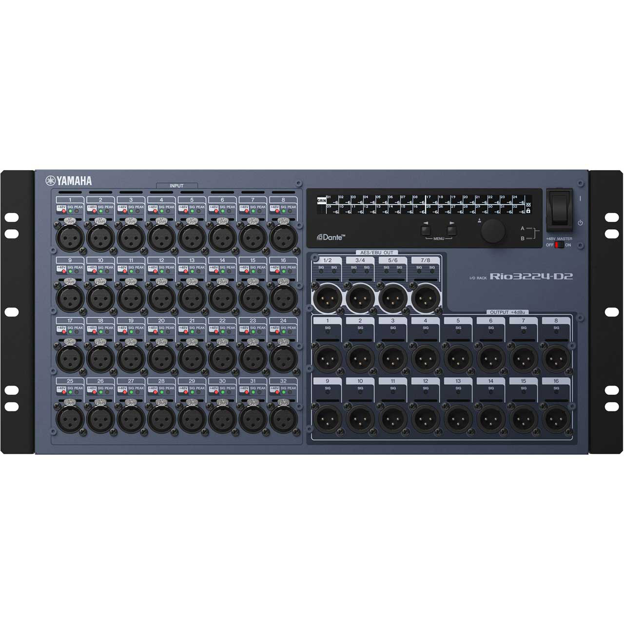 This Yamaha Rio3224-D2 is a high-capacity, high-performance I/O rack is compatible with Yamaha CL and QL series consoles as well as the RIVAGE PM series. It features 32 analog inputs, 16 analog outputs, and eight digital AES/EBU outputs. The Rio3224-D2 connects directly to Dante digital audio networks, allowing flexible system configuration. Dual power supply units are built in for high reliability, and a character/graphic display offers easy visual confirmation.
