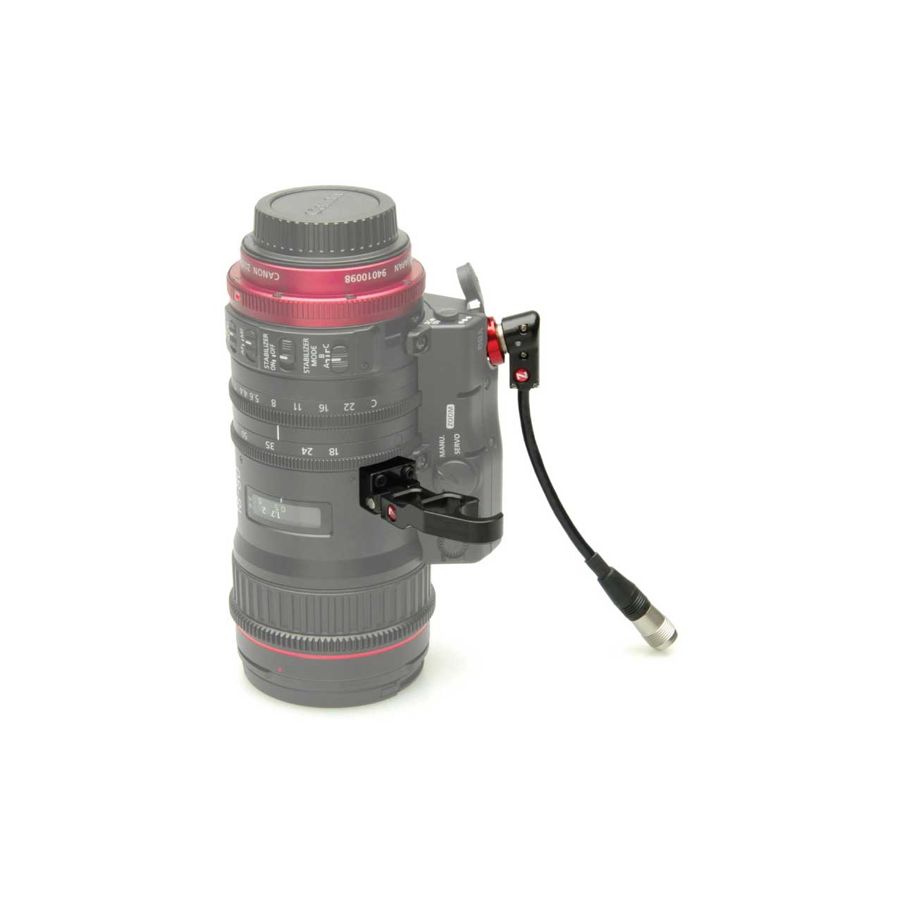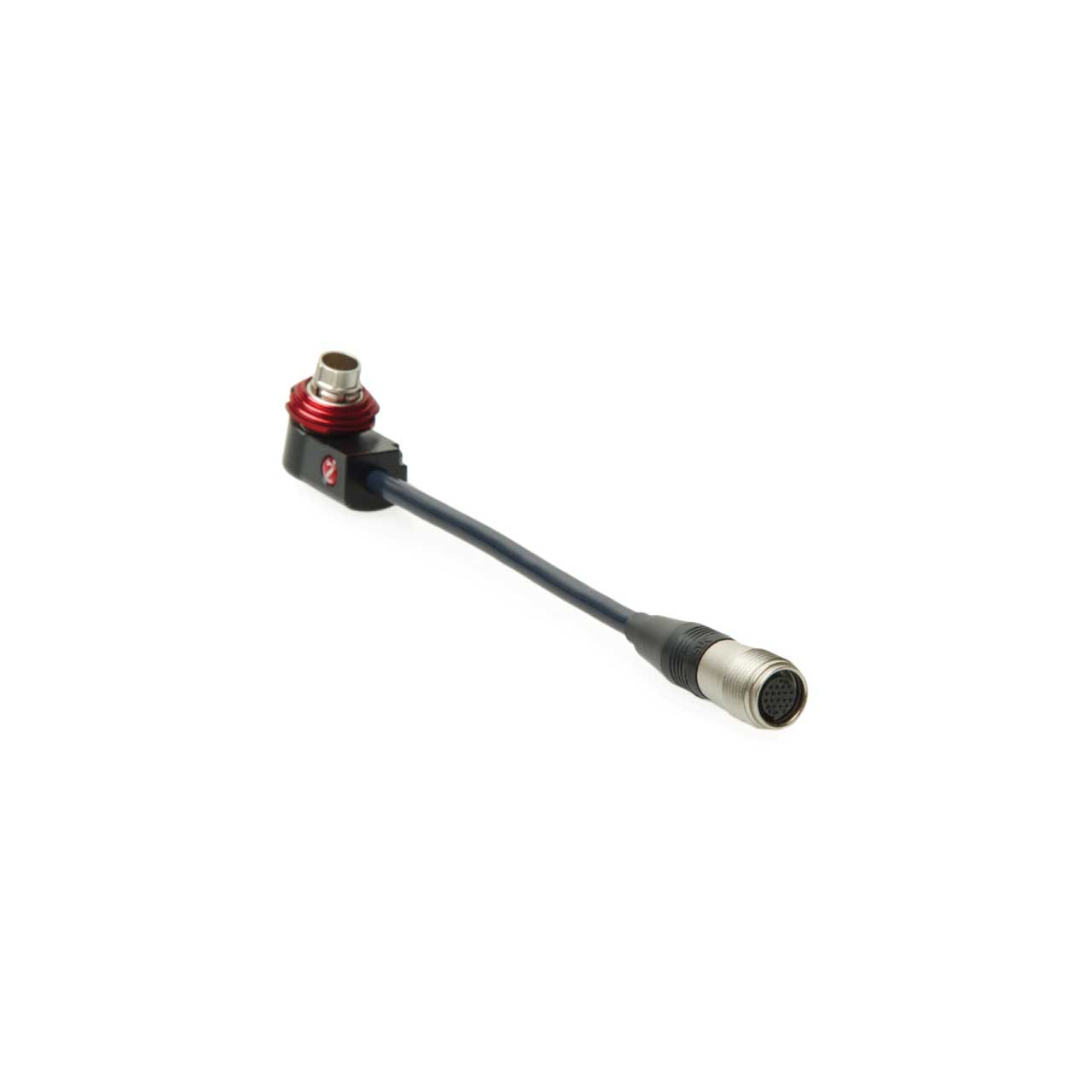The Zacuto Z-C18C Right Angle Extension Cable allows you to extend the relocator cable of the Canon 18-80 lens grip an additional 6" from the lens. The right angle of the cable relieves pressure on the port and keeps the cable from interfering with baseplates or the ground.