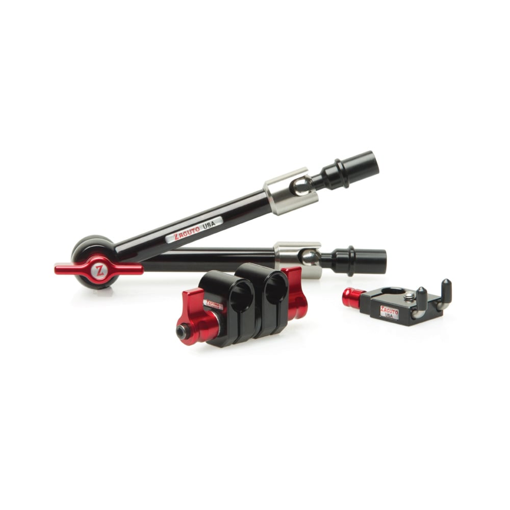 The Zonitor Handheld Kit attaches a 1/4 20 accessory (usually a monitor) to a 15mm rod via an articulating arm. You can mount any device with a 1/4 20 (or 3/8 16 with 1/4 20 to 3/8 16 adapter) screw hole, such as an external on-board monitor, lights, and/or hard drives. The ZicroMicro stays on your accessory - the L prongs will stop it from spinning - and the Zwivel 2 (15mm) stays on the rod. The 12" articulating arm connects the two via a quick release on both mounts. No screwdrivers or unwinding necessary!