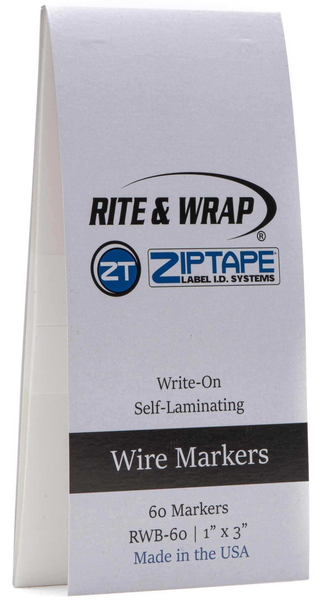 ZipTape Rite & Wrap booklets are available in a convenient 3" x 6" size booklet. Each booklet contains 10 pages of pre-cut self-laminating markers made of .004" thick clear vinyl film, using an acrylic adhesive and mounted on a release liner. You simply write your legend on the white surface, remove the label from the booklet, and wrap it around the cable. The transparent tail laminates over your hand-written text to provide protection and assure readability over time.